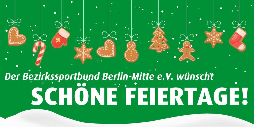 Vom 22.12.2025 bis zum 04.01.2026 bleibt unsere Geschäftsstelle geschlossen. Hinterlegt Eure Anliegen gerne per Mail an info@sportinmitte.de. Ab 05.01. sind wir wieder voll im Einsatz für Euch und den Sport in Mitte!